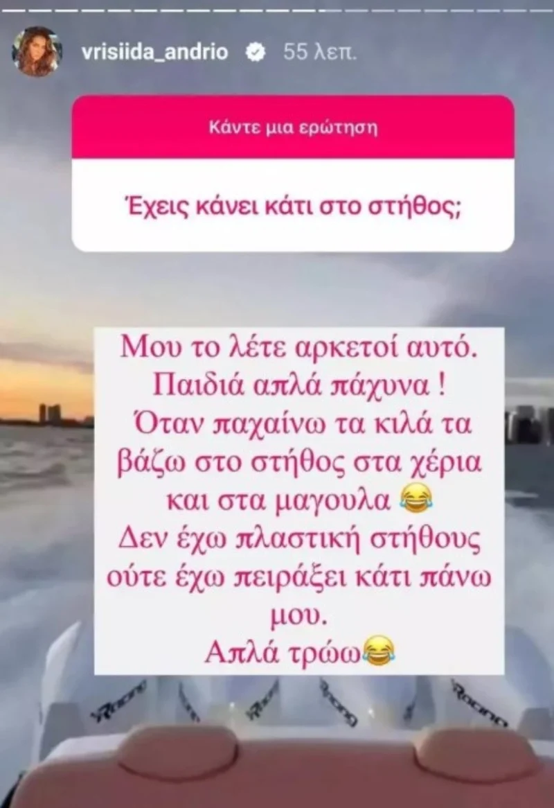 Στο νέο της Q&A στο instagram η Βρισηίδα Ανδριώτου κλήθηκε να απαντήσει σε ερωτήσεις. Ανάμεσα σε αυτές κάποιος ρώτησε: «Έχεις κάνει κάτι στο στήθος;».